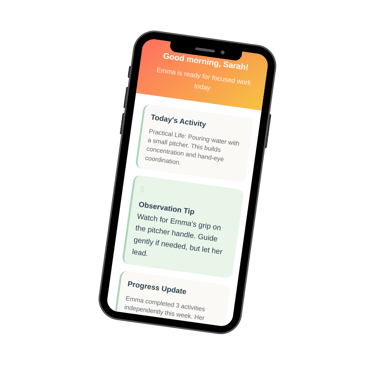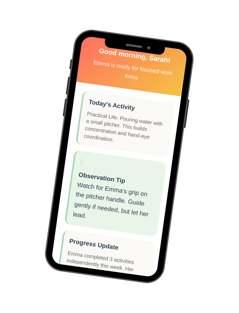 Feel confident guiding your child's growth with personalized Montessori support—powered by AI and grounded in certified educator expertise. No teaching degree required.